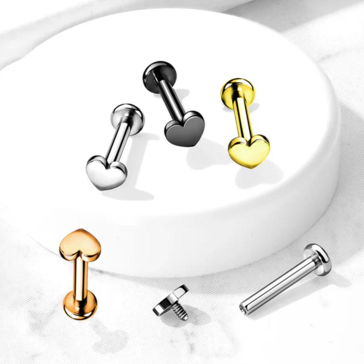 Implant grade ASTM F-136 titanium internally threaded labrets with 3mm heart top